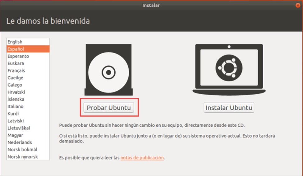 Al encender el equipo con el medio de instalación, se iniciará el instalador de Ubuntu.