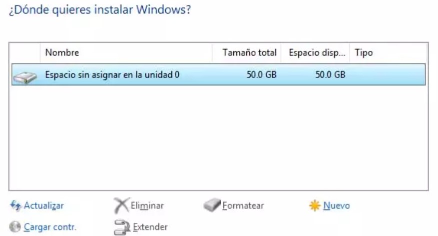Elegir el disco duro donde se instalará Windows; se puede formatear si es necesario y configurar las particiones
