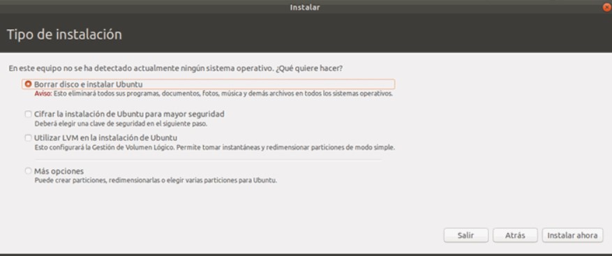 Elegir entre instalar Ubuntu junto a otros sistemas operativos o formatear el disco.