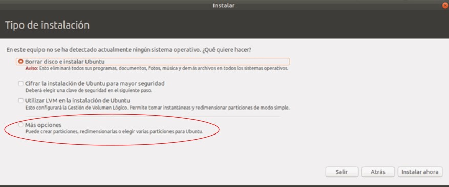 Ubuntu permite crear particiones personalizadas para la instalación (recomendable para usuarios avanzados).