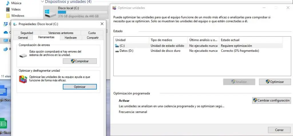 Abre el explorador de archivos, selecciona «Este equipo», haz clic derecho en el disco local (C:), ve a «Propiedades» > «Herramientas» > «Optimizar» y sigue las instrucciones según el estado de TRIM.